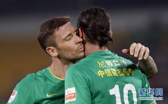 7月12日,北京国安队球员德杨(右)进球后接受队友马季奇的祝贺。 新华社记者张晨摄