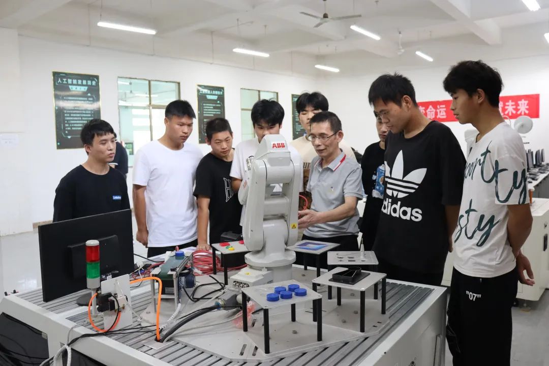 在人工智能中心机器人实训室,同学们在柳克勤老师指导下在电脑上用仿真软件学习机器人编程并且一起实践操作机器人完成搬运工件。 END