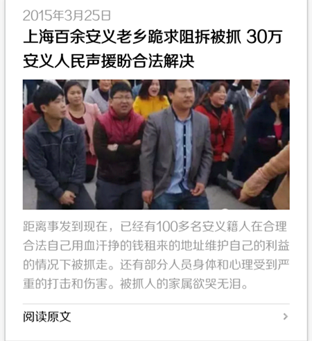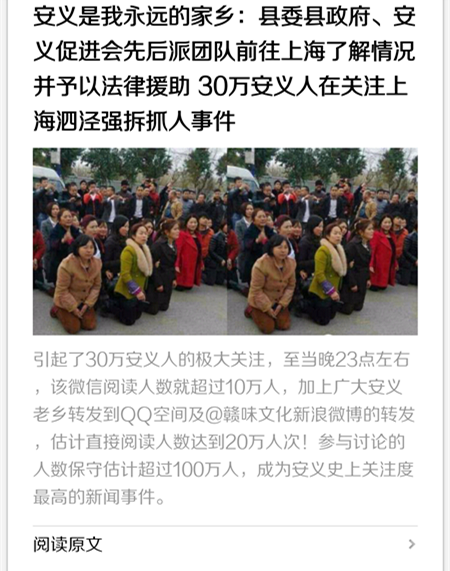 近日,一篇题为《上海百余安义老乡跪求阻拆被抓、30万安义人民声援盼合法解决》的帖子在网上出现。