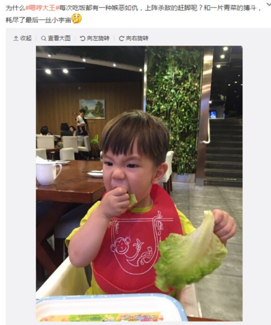 6月16日晚间,霍思燕老公杜江通过微博晒出一组爱子“嗯哼”吃饭的萌照,并留言称,“为什么嗯哼大王每次吃饭都有一种嫉恶如仇,上阵杀敌的赶脚呢?和一片青菜的搏斗,耗尽了最后一丝小宇宙”。