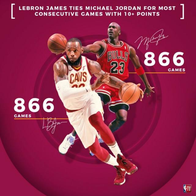 詹皇连续866场得分上双 追平乔丹并列历史第一