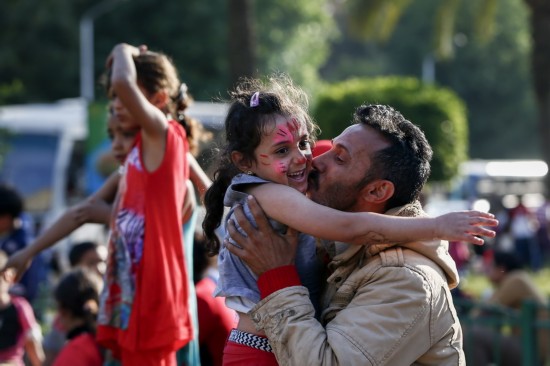 4月13日,在埃及首都开罗,一名脸上涂着油彩的埃及女孩接受父亲的亲吻。新华社记者 崔新钰 摄