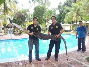 该只身长约2.3米的壁虎,是21日潜入距离亚庇市约15公里以外的京那律渡假村,爬入泳池畅泳。当时,泳池内的游客均被吓得四处窜逃,渡假村的管理层马上致电向野生动物局救援组。