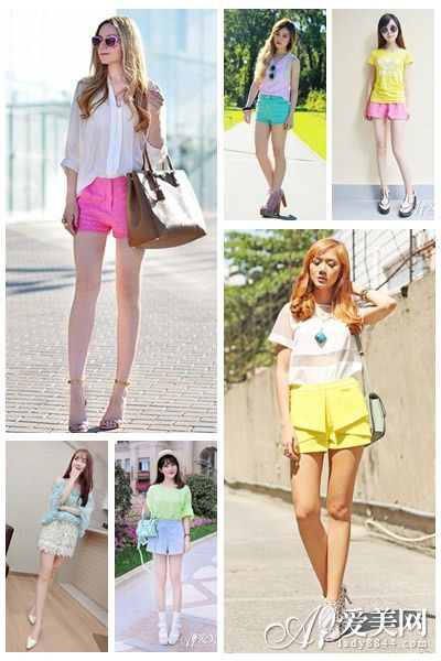 示范搭配:草绿色宽松中袖T恤+浅蓝色宽松短裤+白色厚底凉鞋+薄荷绿手提包+草帽