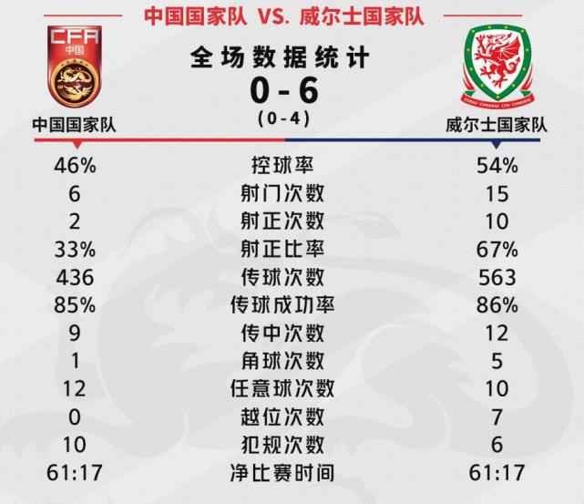 国足的控球率为46%,而威尔士为54%,看上去两队的差距不是太大。射门方面,威尔士15次射门10次命中目标,而国足有6脚,但除了于汉超那一脚之外其余都是搁靴挠痒。角球次数国足1-5落后,但任意球却是12-10占优,尽管从数据上来看,并不像0-6比分体现出那么大的差距。然而国足防线频频送大礼,是酿成完败的最关键原因。
