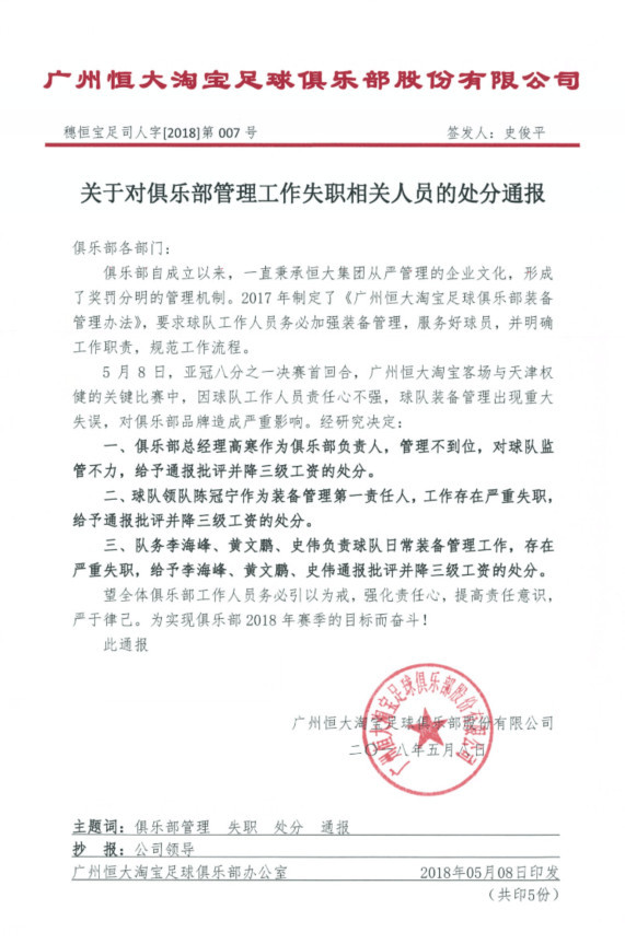 5月8日,亚冠八分之一决赛首回合,广州恒大淘宝客场与天津权健的关键比赛中,因球队工作人员责任心不强,球队装备管理出现重大失误,对俱乐部品牌造成严重影响。经研究决定: