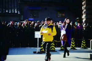 昨天,报考中戏的考生在考场外等候。