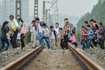 每逢学校放学时,便出现浩浩荡荡的穿越铁路的大军。郝飞摄
