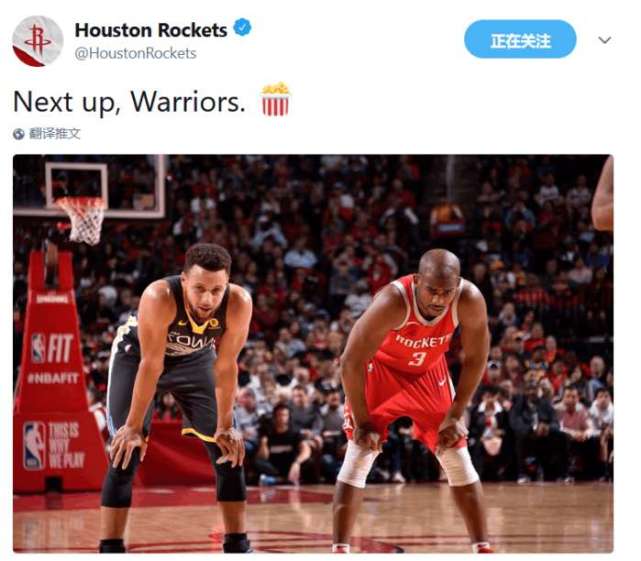 在淘汰鹈鹕后,勇士官推也是第一时间向火箭下了战书:稍后见@火箭!