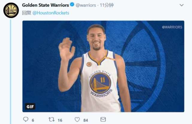 勇士官推则在这条推特下面用克莱汤普森的动图给予了火箭回复:欢迎你们!
