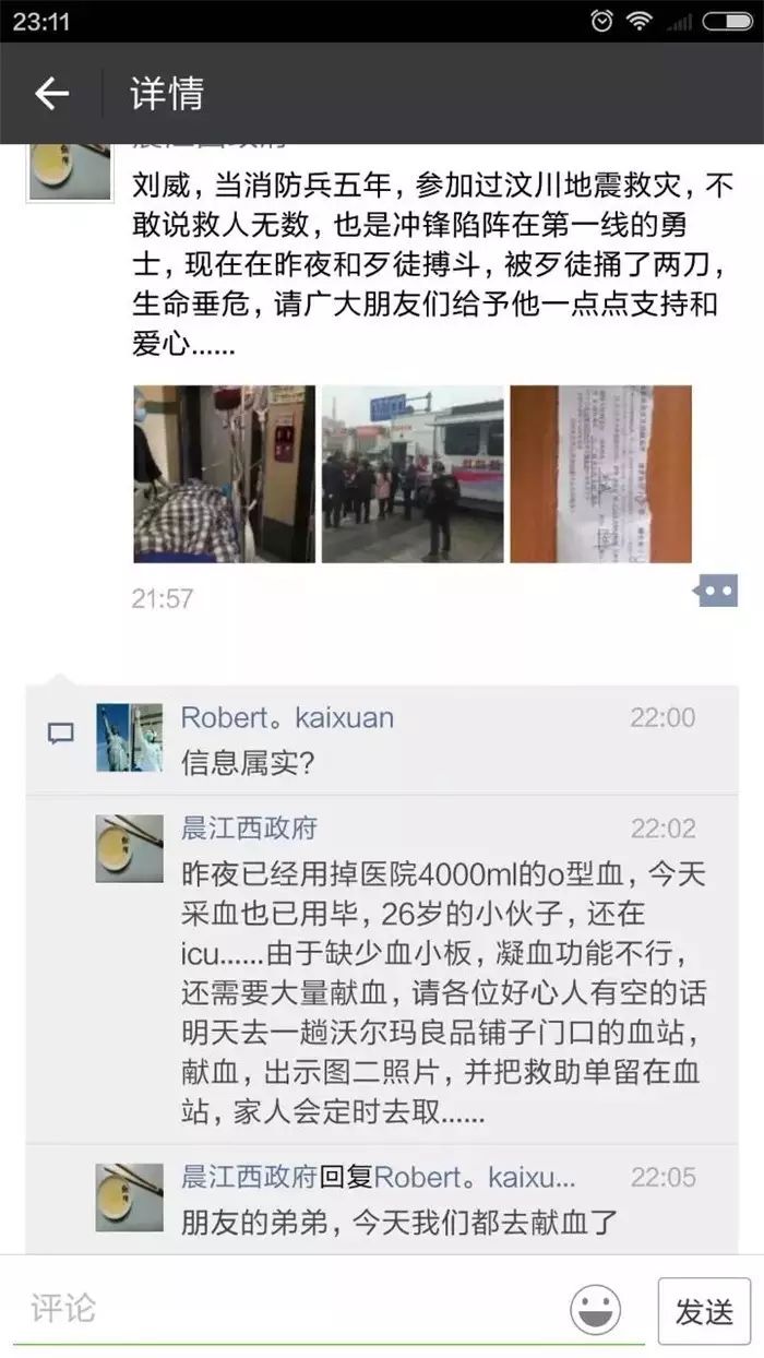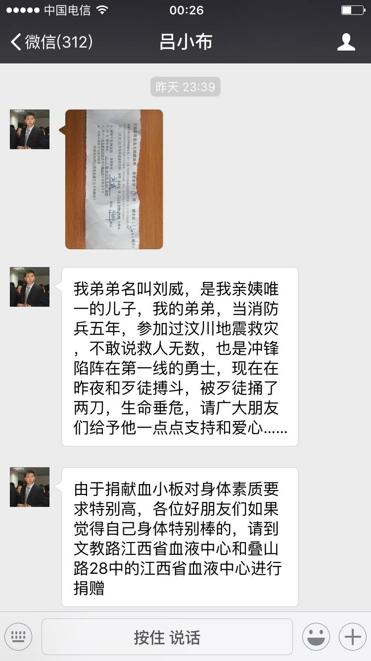 “我弟弟名叫刘威,是我亲姨唯一的儿子,我的弟弟,当消防兵五年,参加过汶川地震救灾,不敢说救人无数,也是冲锋陷阵在第一线的勇士,现在在昨夜和歹徒搏斗,被歹徒捅了两刀,生命垂危,请广大朋友们给予他一点点支持和爱心…… ”