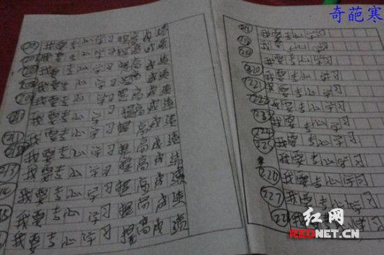 李先生的侄子小明(化名)是邵东县一所小学的学生,在开学前夕,李先生发现侄子在做一项特别的寒假作业,将“我要专心学习提高成绩”抄七百遍。