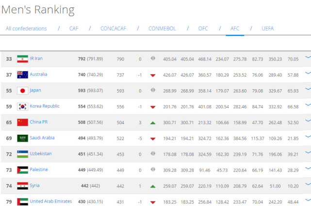 FIFA最新排名:国足再升3位第65 超沙特亚洲第5