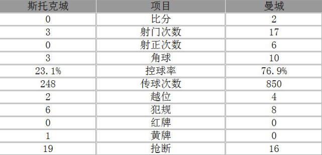 全主力出击的曼城在客场控制比赛,蓝月亮射门17比3,射正6比0,斯托克城的进攻无法对埃德森造成威胁,控球率方面曼城高达76.9%,瓜帅用自己最擅长的方式赢下这场比赛。