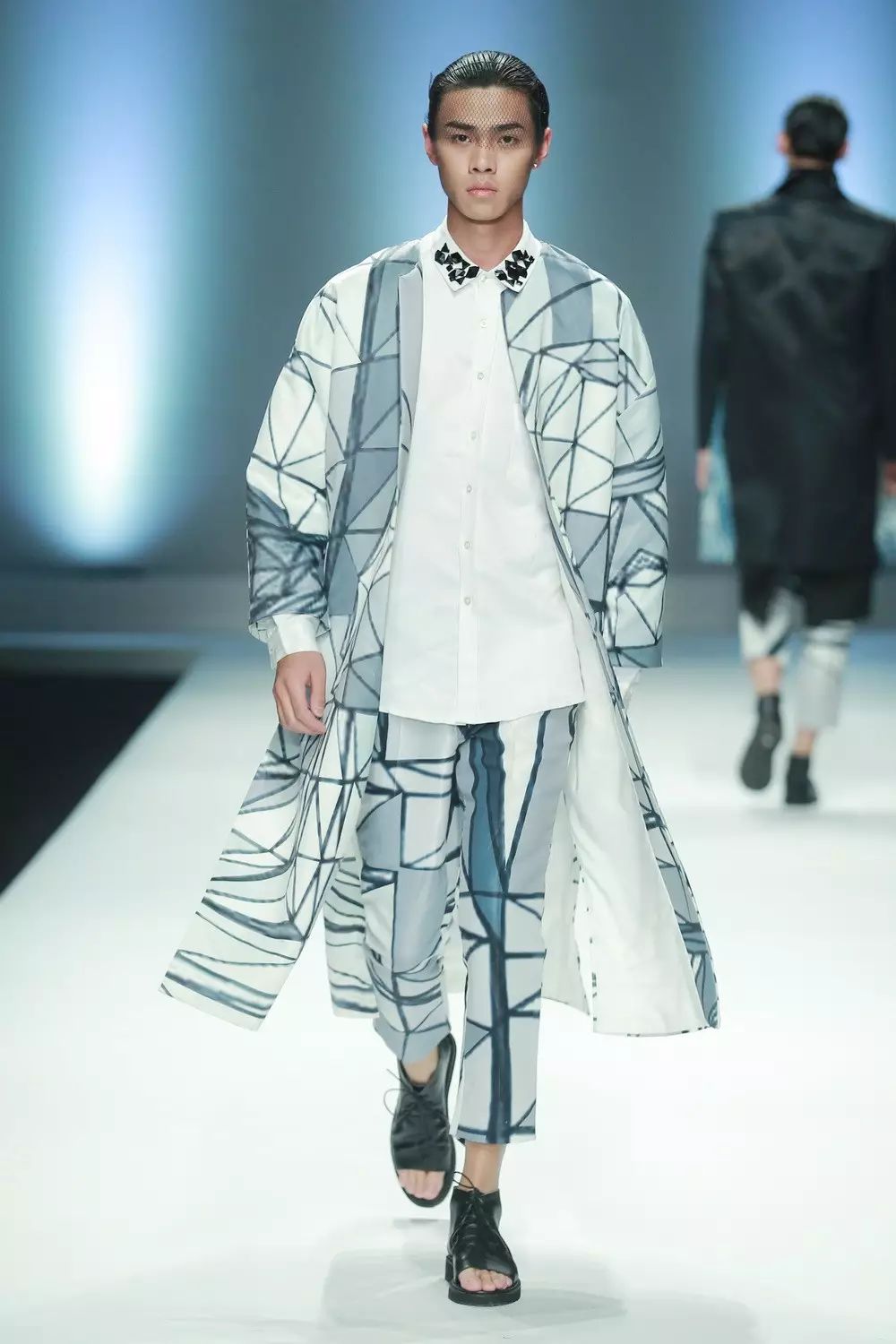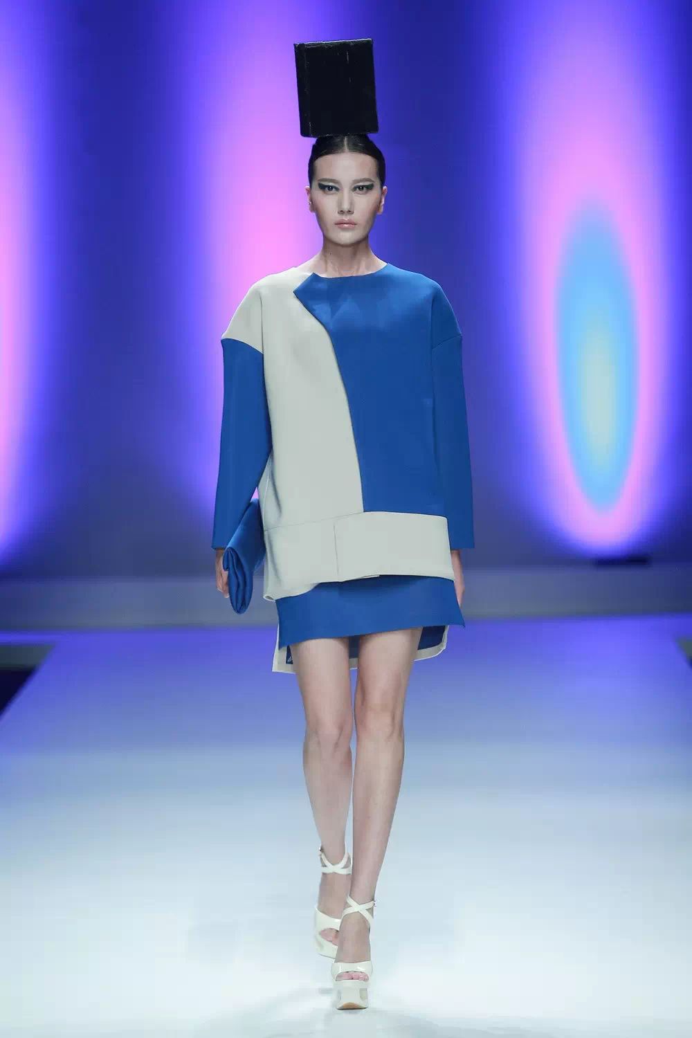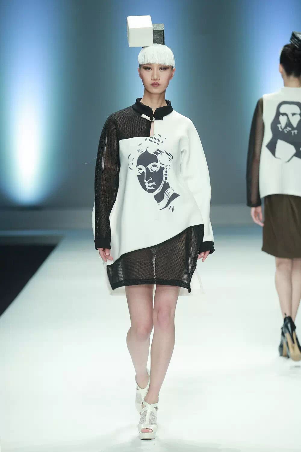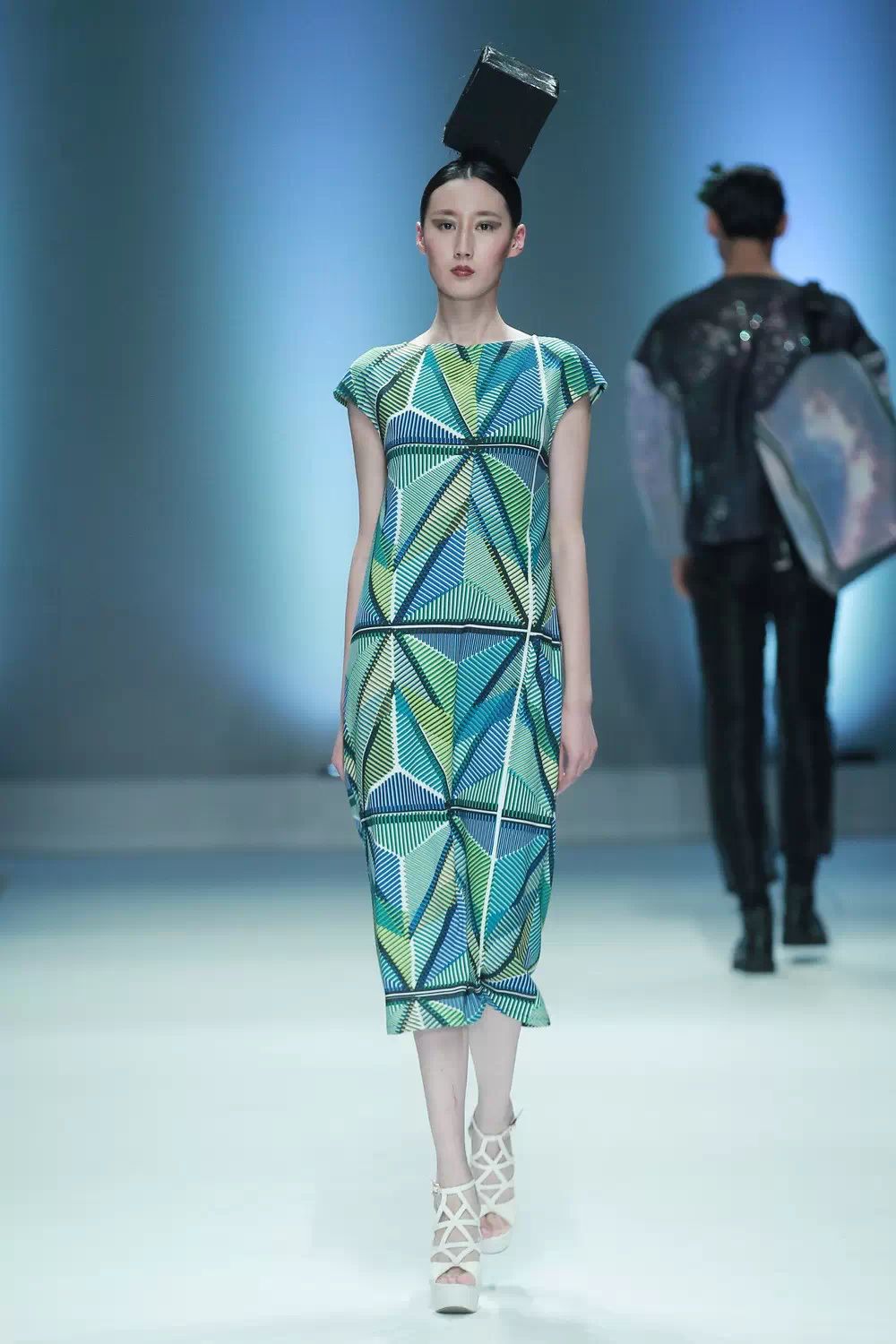 和达科技。从宏观到微观,神秘炫目的科学世界充满了严谨冷静之美。在这组设计中,有序的几何印花成为服装表面肌理,黄绿色与灰色的碰撞散发着化学气息,中性图案与复古款式的结合;同时,立体剪裁带来强有力的视觉冲击,不规则、不对称的裁片仿佛纵横交错的异次元空间。整组设计将传统经典与现代科技时空交融生成和实的生物规律,无不体现出“天人合一”的思想。