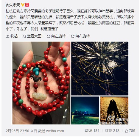 留言中,朱孝天称“即将来临的深夜也不再令人感觉黑暗了,既然相思已化成一颗颗生于南国的红豆,那么春来了,冬走了,我们,就这么定了”。而照片中不仅有两个人在沙滩依偎的影子,还有夜景、烟花等照片。