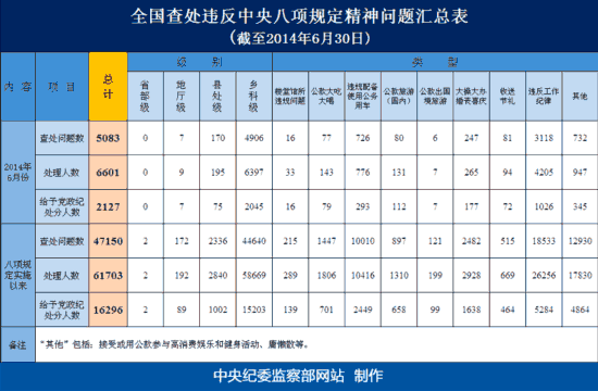 截至2014年6月30日,自中央八项规定实施以来,全国共查处违反中央八项规定精神问题47150件,处理人数61703人,给予16296人党政纪处分。今年6月,查处违反中央八项规定精神问题5083件,处理人数6601人,给予2127人党政纪处分。