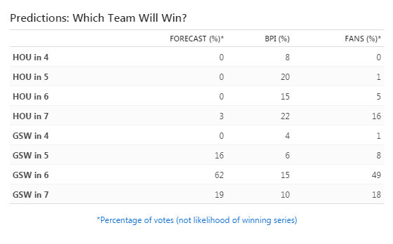 FiveThirtyEight:火箭79%的概率晋级,勇士21%概率晋级;