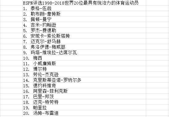 ESPN近日评出1998-2018年间20名最具统治力运动员排名榜单,伍兹占据榜单首位,费德勒、舒马赫和梅威瑟也榜上有名。尽管很多明星登榜让人心服口服,但就像梅西和C罗谁更牛永远存在争议,这份名单一经发布也受到些许质疑,毕竟几位天王成为看客不免让人鸣不平。