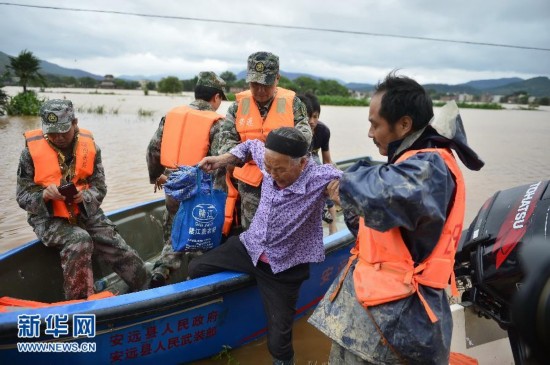 5月21日,救援人员将一位老人从冲锋舟上接到安全地带。近日,江西部分地区遭遇连日暴雨,于都县车溪乡发生洪水漫堤险情。5月20日,该乡梅江河水位不断上涨,洪水漫过堤岸,长度达2600多米。救援人员先后转移了过万名群众。5月21日,除少数不愿转移的村民外,其余受洪水影响村民已全部抵达安全地带。目前,当地洪水水位已开始下降,通往村庄的道路正在逐步打通。新华社记者 周密 摄