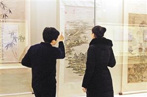 2月16日,沈阳故宫博物院,观众在观看首次展出的董邦达设色《青溪落雁图》。