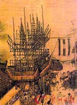 在“大千脚店”附近有一座特别的建筑,像哥特式教堂一样冲天而立,这种建筑叫“彩楼欢门”。“彩楼欢门”是两宋时代流行的店面装饰, 或是用彩帛、彩纸 等所扎而成的门楼,或者是用木质杆件绑缚而成阁楼形状,以壮声势。这种结构在画中还有几处,比如“孙羊正店”门前就有巨大的“彩楼欢门”。南宋后期,“彩 楼欢门”销声匿迹,究其原因,可能是南宋后期连年战争使都城临安的经济不再能支撑“彩楼欢门”这种奢华而容易损坏的店面装饰形式;也可能是这种店面装饰习 俗逐渐被其他做法所取代。