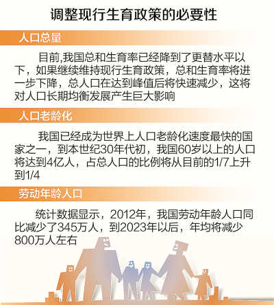 李斌说,进入上世纪90年代以来,我国总和生育率就已经降到了更替水平以下,目前为1.5左右。如果继续维持现行生育政策,我国总和生育率将进一步下降,总人口在达到峰值后将快速减少,这将对人口长期均衡发展产生巨大影响。同时,我国人口结构性问题也日益突出,我国已经成为世界上人口老龄化速度最快的国家之一。到本世纪30年代初,我国60岁以上的人口将达到4亿人,占总人口的比例将从目前的1/7上升到1/4。统计数据显示,2012年,我国劳动年龄人口同比减少了345万人,到2023年以后,年均将减少800万人左右。
