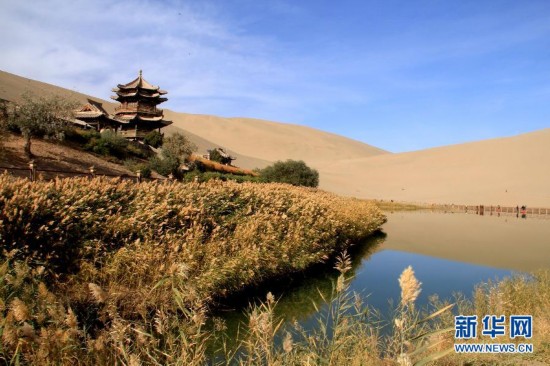 秋景迷人的甘肃省敦煌市月牙泉(10月15日摄)。深秋时节,甘肃省敦煌市月牙泉秋景迷人,蓝天、白云、鸣沙山和泉边的芦苇、胡杨、柳树倒映泉中,宛如一幅美丽的画卷,吸引了众多中外游客。新华社发(张晓亮 摄)