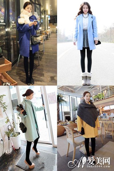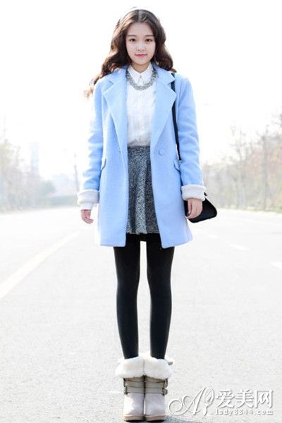 小编解析>>> 浅蓝色呢子大衣内搭白色衬衫,下穿高腰短裙,配上黑色裤袜和毛绒高跟短靴,如此温婉淑女的风格,淡雅不失时尚感,给人的感觉很舒服干净,透着清新味道,深受女孩们的喜欢。