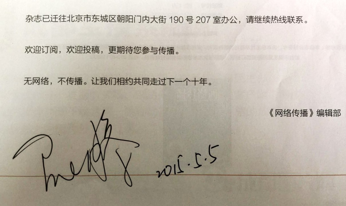 报告会结束后,小马哥欣然在《网络传播》杂志上签名,祝杂志越办越好。