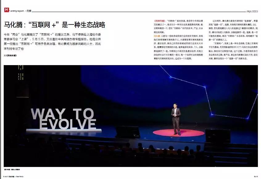 其实,早在报告会之前,《网络传播》杂志已经对马化腾就“互联网+”进行了独家专访,更多干货敬请关注《网络传播》杂志四月刊。