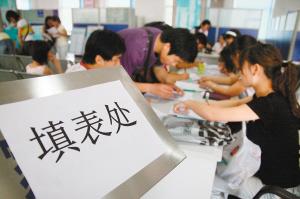 西安某人才市场内,应聘者正在填写报名表 。窦翊明 摄