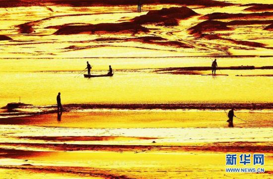 3月23日,在宁波市镇海区三圣殿水库,几名捕鱼人在夕阳下捕鱼。镇海三圣殿水库因年初堤坝维修,水库的水被排放掉不少,不少区域已可见底。新华社发(胡学军 摄)
