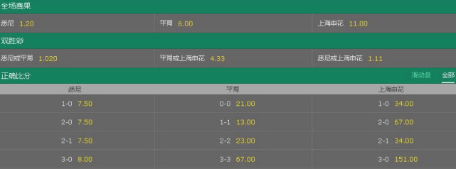 具体比分盘也充分反映了这一情况,悉尼2-0的赔率为7.5,3-0的赔率为8.00。申花1-0的赔率达到了34.00。这场比赛几乎是一边倒,申花可能会大比分落败。