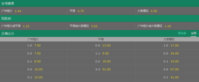 比分盘赔率方面,恒大1-0和2-0的赔率都为7.50,1-1赔率为9.00,大阪樱花1-0的赔率高达17.00。因此不出意外,恒大将轻松击败对手晋级。