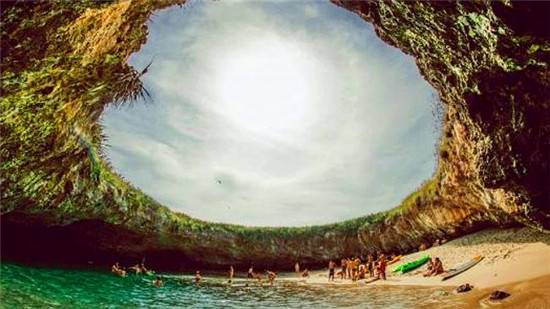 隐密沙滩位于墨西哥巴亚尔塔港海岸32千米外玛莉达斯岛的班德拉斯湾入口。从上往下看,隐密沙滩似乎是岛上绿草丛中的一个大洞。下面是一处完全隐蔽但非常巨大的圆形沙滩,只有游泳或乘皮艇穿过岩石隧道才能抵达。游客可以在里面享受柔软的沙滩,晶莹剔透的碧蓝海水。这里是晒日光浴,游泳和浮潜的绝佳场所。玛莉达斯岛是几百年前火山活动形成的,但这块“地下”沙滩如何形成就不得而知了。这个大洞也许也是由火山活动导致,但也有人称它是20世纪早期墨西哥政府试验炸弹造成的。无论它如何形成,他现在依然成为一处游客花费一整天必游的秘密胜地。