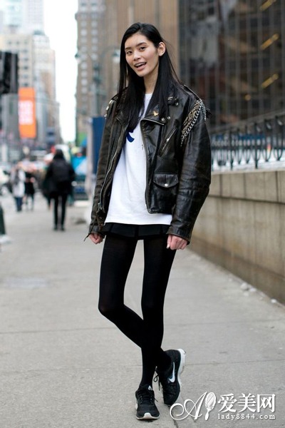 示范搭配:白色T恤+黑色迷你小短裙+黑色皮革夹克+黑色运动鞋,作为国际知名模特的奚梦瑶,同样也是摄影师镜头下的挚爱。