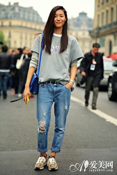 示范搭配:灰色T恤+蓝色破损牛仔卷边长裤+印花运动鞋+深蓝色皮革单肩挎包,刘雯作为亚洲范围内在全球排名最高的模特,街拍向来是层出不穷,闲适帅气的风格也一直出境频率最高的装扮。