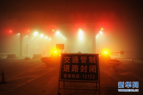 12月7日晚,石黄高速河北武强入口已经关闭。当日16时,河北省将大雾预警升级为最高级别的红色。目前,衡水、邢台、邯郸、保定、沧州、石家庄大雾持续,部分地区能见度不足50米。河北省内多条高速处于关闭状态,11个地市空气质量全部达到污染级别。新华社发(牟宇 摄)