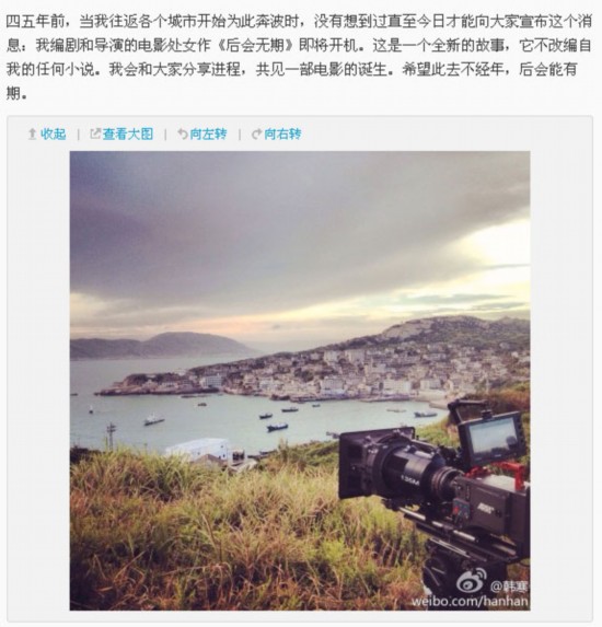 “四五年前,当我往返各个城市开始为此奔波时,没有想到过直至今日才能向大家宣布这个消息:我编剧和导演的电影处女作《后会无期》即将开机。这是一个全新的故事,它不改编自我的任何小说。我会和大家分享进程,共见一部电影的诞生。希望此去不经年,后会能有期。”