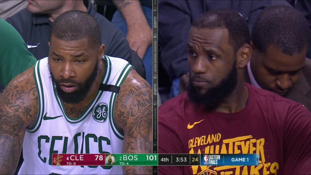 詹姆斯说:“第一个回合,我们全力以赴,即将哨响之际,马库斯-莫里斯错失了一记跳投,我们搞砸了,让他们直接扣了一个,我们继续回击,乔丹-克拉克森错失投篮,他们抢到了篮板,我们得回到本方立足防守,我们必须要阻止攻势,这时他们准备在底线做文章,杰森-塔图姆把球传给了底角的斯马特,他投中了三分,我们再次反击,还是没进。然后塔图姆又来了个欧洲步右手上篮,之后就是暂停。”