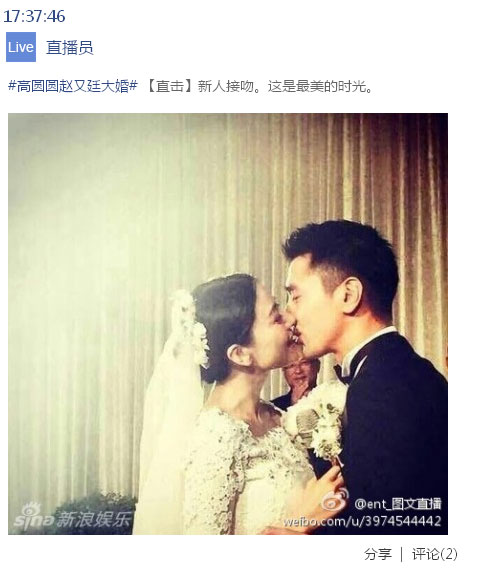 2014年11月28日16:30分,高圆圆赵又廷在台北寒舍艾美酒店举办婚礼。有网站曝光了婚礼的内场照,目前包括赵薇、Angelababy、姚晨等明星已经到场。今早高圆圆正式成为台湾媳妇,登记的那刻相视而笑,幸福洋溢。