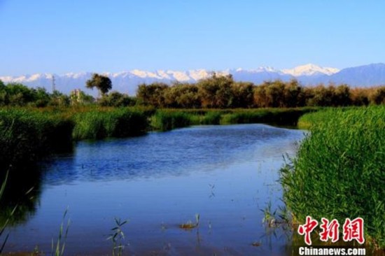 7月9日,雨后的甘肃张掖湿地,草木青翠欲滴,远望祁连雪峰似近在咫尺。7月7日至8日,地处甘肃河西走廊中部、祁连山下的张掖市普降小到中雨,雨后的张掖晴空万里,祁连雪峰格外醒目。碧绿的湖水、青翠的草木以及远处白雪皑皑的祁连山,让七月的张掖美不胜收。