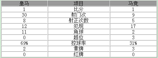皇马全场控球率达69%,射门30比9领先,角球11比2,各项统计基本都占优势,不过主队射正仅8比5稍占上风,进攻效率无疑马竞更出色。