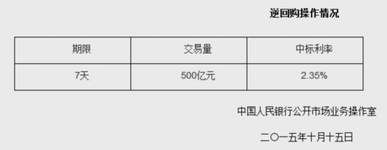 据中国人民银行网站消息,人民银行于本周四(10月15日)以利率招标方式规模为500亿元逆回购操作。此次逆回购中标利率2.35%,期限7天。(中新网金融频道)
