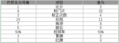 皇马全场控球率50.2%,射门22次遥遥领先,射正6次打入2球,还3次击中门柱,进攻效率上佳。巴黎全场只有8次射门,主场完败。
